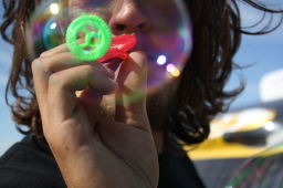 We blow bubbles at the morning sun. The delicate orbs pop on the wild grass,